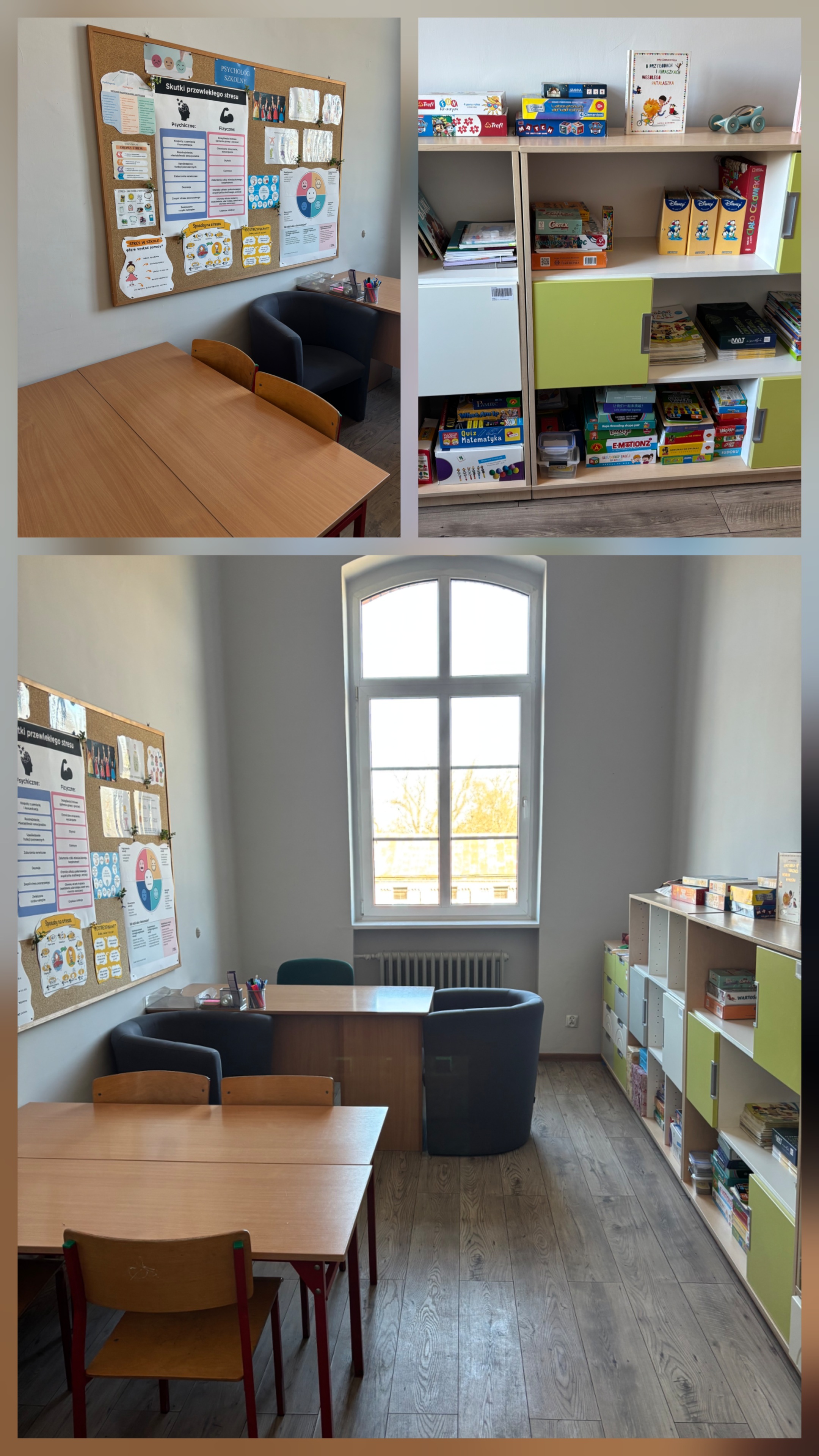 Gabinet psychologa szkolnego jest miejscem zapewniającym uczniom poczucie bezpieczeństwa, spokoju oraz komfortu podczas rozmów. Przestrzeń jest dostosowana do pracy indywidualnej oraz zajęć z małymi grupami uczniów. W gabinecie znajdują się materiały edukacyjne i terapeutyczne wspierające rozwój emocjonalny i społeczny dzieci.